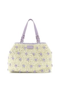 Handgehäkelte schultertasche mit raffiniertem handwerklichem design. sie verfügt über einen magnetverschluss einen karabinerhaken zur verstellbaren taille und ein goldfoliengeprägtes logo-etikett. perfekt für den sommer. maße: 44 cm (länge) × 31 cm (höhe) × 15 cm (tiefe).