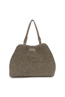 Eine geräumige und vielseitige einfarbige handgefertigte häkeltasche. mit magnetverschluss verstellbaren seitenschlaufen mit karabinerhaken und einem goldfoliengeprägten logo-etikett – perfekt für sommerliche looks. maße: 44 cm (länge) × 31 cm (höhe) × 15 cm (tiefe)