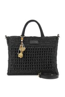 handtasche aus bast mit häkelarbeiten und anhängern black