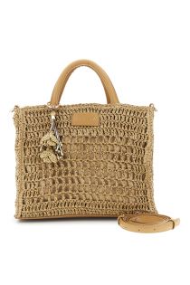 Handgefertigte handtasche aus gehäkeltem bast mit dekorativem anhänger. mit tragegriffen und abnehmbarem schulterriemen in lederoptik ist sie das ideale sommeraccessoire – praktisch und schick zugleich. maße: 30 cm (länge) × 25 cm (höhe) × 10 cm (tiefe)