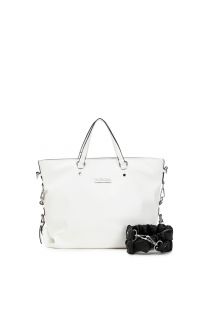 Handtasche mit Schnürungen an den Seiten mithilfe von hübschen Schnallen. Sie kann dank einem zusätzlichen besonderen gekräuselten Schultergurt in Kontrastfarbe auch anders getragen werden