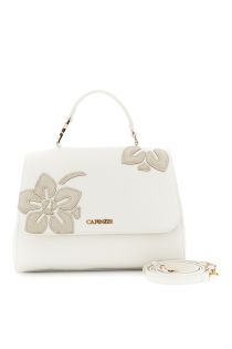 handtasche mit überschlag aus lederähnlichem material mit floralen applikationen ivory