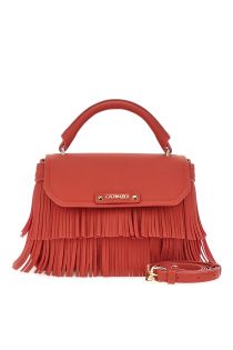 Handtasche aus Kunstleder mit Überschlag und Zierfransen, einem Metalllogo auf der Vorderseite, einer Inneneinteilung und einem abnehmbaren Schulterriemen für einen vielseitigen und markanten Stil.