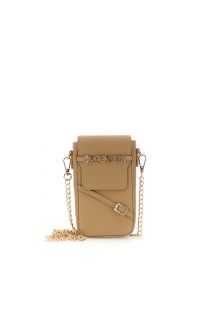 Handyhülle in Lederoptik mit Klappe, verziert mit Schriftzügen und Schnalle. Abnehmbarer Schulterriemen aus Kette.