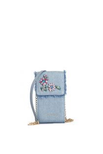 handytasxhe gefranster jeansstoffm mit blumen aus strasssteinen und strass denim