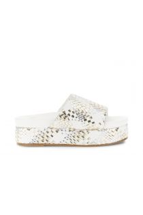 Plateau-sandalen in lederoptik erhältlich in weiß gold und silber oder in den farben gold bronze und platin. hohe leichte sohle breiter riemen und perfekter tragekomfort für sommerliche looks. 3.5 cm sohlenhöhe. verleihen sie ihrem alltagsstil einen hauch von eleganz.