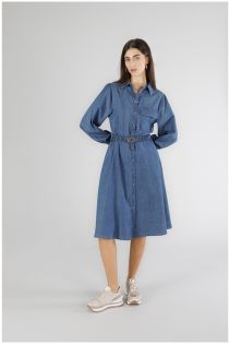 Hemdblusenkleid mit langen ärmeln und elastischem gürtel mit logo-schnalle. kleidungsstück aus chambray-denim-canvas. knopfverschluss. perfektes freizeitstück für einen geschäftigen tag in der stadt.