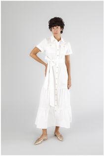 Langes hemdblusenkleid mit volant. vorderer verschluss mit knöpfen und schärpe in der taille. kurze ärmel mit bündchen. dank seiner einfachheit und vielseitigkeit ein muss für den sommer. das leichte kleid begleitet sie von morgens bis abends.