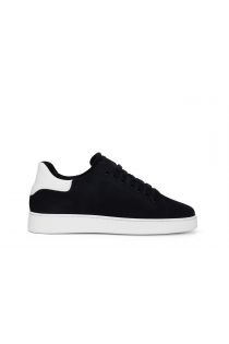 Herren-schnürsneaker aus wildleder und leder. futter und innensohle sind aus leder. schuh mit abgerundeter form.