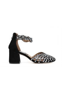 Gitter-sandaletten mit reißverschluss am blockabsatz angereichert mit einer dreieckigen strass-borte am knöchel. 60 mm hoher absatz.