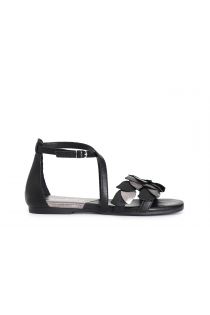 Flache ledersandalen die hinten geschlossen sind und einen doppelten riemen haben der am knöchel gebunden wird. zweifarbiges dekor auf der vorderseite das an ein geflecht von blättern erinnert.