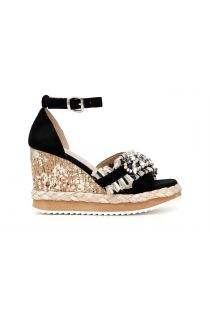 Hinten geschlossene Sandalen aus Rauleder und gefranstem mehrfarbigem Bast mit Strass-Accessoire und kleinen Holzperlen auf Keilsohle aus mehreren Materialien.