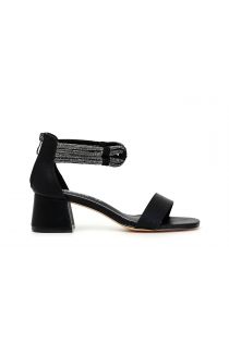 Hinten geschlossene Sandalen mit Knöchelriemen aus Mikrostrass auf mittlerem Absatz.