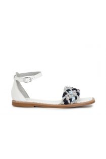 Hinten geschlossene Sandalen mit einem Strassband und geflochtenem Bast, Ledersohle und Rahmen mit kleinen Nieten. Innensohle und Futter aus Leder.