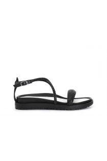 Sandalen mit überkreuzung und strasssteinen bestehend aus einem flachen riemen und einer ristschlaufe die mit einem riemchen geschlossen wird.