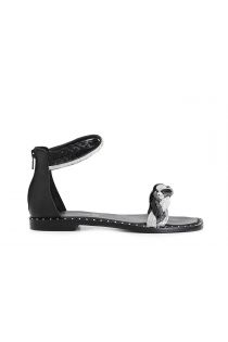 Hinten geschlossene Sandalen mit Reißverschluss, verziert mit einem Strassband, geflochtenem Bast und einer Ledersohle mit Rahmen, der mit kleinen Nieten besetzt ist. Innensohle und Futter aus Leder.