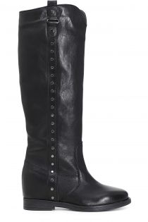 Hohe Lederstiefel mit seitlichen Nieten und eingearbeitetem Keilabsatz. Die Ziernähte vermitteln Harmonie und Dynamik.