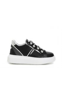 Hoher Sneaker aus Leder mit Glitzer- und laminierten Einsätzen. Schnürung mit Maxi-Strass-Verzierung. Schmale und lineare, hochgezogene Running-Sohle mit Metall-Logo an der Außenseite