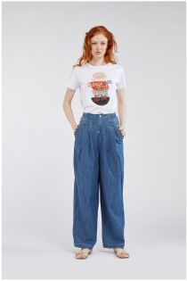 Weite Hose mit Falten aus weichem Chambray-Gewebe mit Applikation aus länglichen Glasperlen an den Taschen, die für einen lebhaften Touch sorgen. Kleine Abnäher in der Taille, die in Höhe der Taschen ein wenig Volumen schaffen.