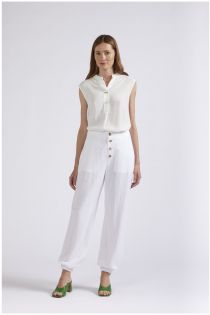Hose mit sichtbaren knöpfen und gummizug am knöchel aus einem kühlen leinenmischgewebe.