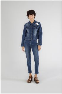 Jeansjacke aus superelastischem canvas. verschluss mit füßlingen und abnehmbarer nadel. kleidungsstück das zu total-denim-looks und lässigen anlässen mit t-shirts und flachen schuhen passt.