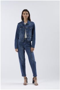 Jeansjacke aus bequemem canvas. personalisierte plaketten schmücken die schultern. lange ärmel. verschluss mit sichtbaren goldknöpfen.