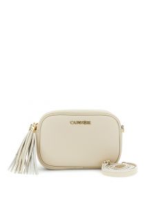 kameratasche aus gehämmertem leder mit schultergurt, karabinerhaken und quaste cream