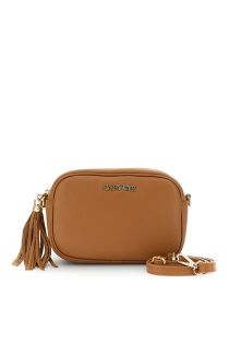 kameratasche aus gehämmertem leder mit schultergurt, karabinerhaken und quaste tan