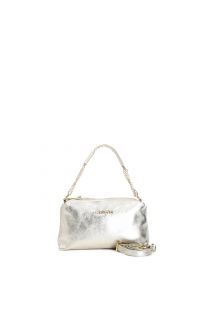 Kameratasche aus metallic-leder. doppelter reißverschluss mit kettengriff mit griff. abnehmbarer schultergurt und reißverschluss.
