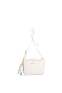 kameratasche aus strukturiertem leder mit schultergurt mit karabinerhaken und quaste beige