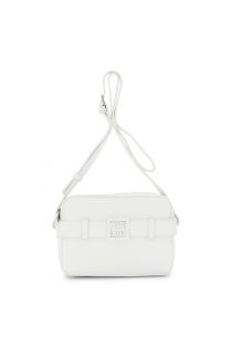 kameratasche in gehämmertem leder-look mit gürtelmotiv und logo-accessoire ivory