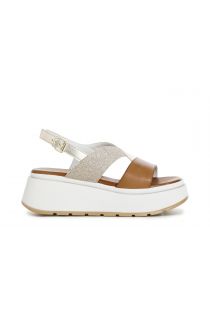 zweifarbige asymmetrische sandalen aus leder und glitzer auf keilsohle.