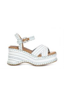 Sandalen mit ethnischem kreuz. gewickelter keilabsatz immer aus ethno-stoff. die bequeme innensohle aus echtem leder sorgt dafür dass der schuh auch nach mehrstündigem tragen noch bequem ist. der absatz ist 8 cm hoch während das plateau 4 cm beträgt.