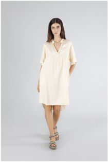 Kleid im tunika-stil mit längenunterschied zwischen vorder- und rückseite. aus mischgewebe und viskose-satin-einsatz. ellenbogenlange ärmel. leichtes und frisches kleid für heiße sommertage.