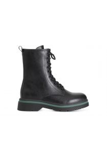 Schwarze damenstiefelette aus kunstleder zum schnüren. gummisohle mit grünem einsatz 40 mm absatz.