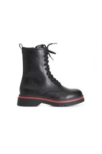 Schwarze damenstiefelette aus kunstleder zum schnüren. gummisohle mit rotem einsatz 40 mm absatz.