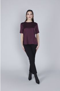 Elegante Kurzarmbluse aus Stretch-Viskose-Satin mit schlichtem und raffiniertem Design. Normale Passform. Das Model ist 172 cm groß und trägt Größe S.