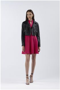 Kurze biker-jacke aus kunstleder. kragen mit aufschlägen lange ärmel. verschluss mit reißverschluss.