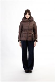 Kurze daunenjacke mit umschließendem kragen und gürtel mit logo an der taille. aus mattem nylon. vielseitig und praktisch ein unverzichtbarer bestandteil der garderobe der neuen herbst-winter-saison.
