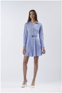 Kurzes chemisier-kleid mit logo-schnallengürtel. langärmeliges kleid aus gestreiftem stretch-baumwollpopeline.