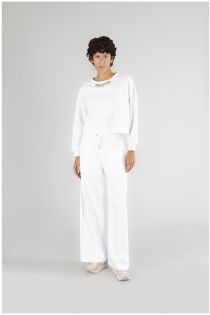 Kurz geschnittenes sweatshirt mit strassapplikation am ausschnitt. lange ärmel. für alltagsoutfits mit einem hauch glamour.
