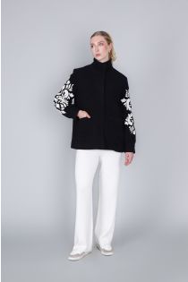 Kurzer Damenmantel aus warmem Material mit exklusiver Kontraststickerei an den Ärmeln. Ein lässiges Modell mit einzigartigem Design, perfekt für einen eleganten und individuellen Look. Normale Passform. Das Model ist 174 cm groß und trägt Größe S.