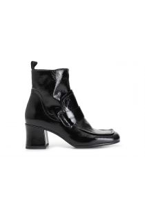 Damenstiefelette aus lackleder mit ziernähten auf dem oberschuh. dank der schicken ausführung kann der schuh zu jedem outfit getragen werden egal ob im alltag oder am abend. die spitze und der absatz sind quadratisch.
