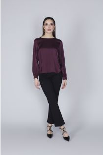 Elegante Bluse aus Stretch-Viskose-Satin mit langen Ärmeln und U-Boot-Ausschnitt. Perfekt für einen stilvollen Büro- oder Abendlook. Das Model ist 172 cm groß und trägt Größe S.