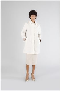 Ein unverzichtbares kleidungsstück in der frühlingsgarderobe. langer einreihiger staubmantel aus technischem stoff mit bedrucktem futter. lange ärmel.
