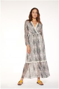 Langes Kleid aus leichtem bedrucktem Viskose-Voile. Der Volant und der Ausschnitt sind mit Makramee-Posamenten verziert