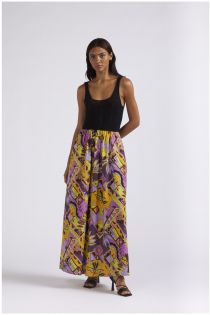 Ärmelloses langes kleid. das oberteil ist aus einem gehäkelten baumwollmischgarn gestrickt. der rock ist aus bedruckter baumwollpopeline gefertigt.