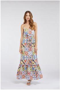 Frisches langes Kleid in der Art eines Strandkleids, bei dem ein Stretch-Einsatz am Rückenteil für gute Passform sorgt. Volant am Abschluss, dünne Träger und Schärpengürtel in der Taille. In drei exklusiven Druckmustern erhältlich.