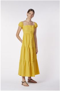 Langes kleid mit volants knöpfung vorn und freien schultern