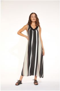 Langes Kleid mit weiter Linie aus bedruckter Viskose mit tiefem V-Ausschnitt und Kontrastrand